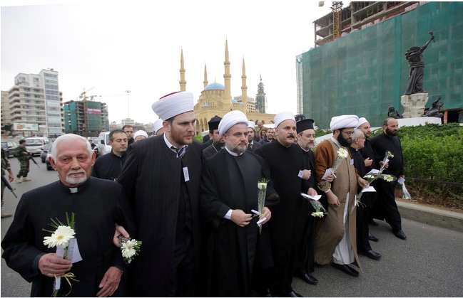 Clerics representing the various Lebanese religious communities march for peace in central Beirut on the eve of the anniversary of the civil war in April 2013. [Joseph Eid/AFP]