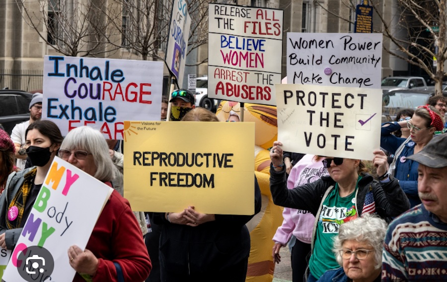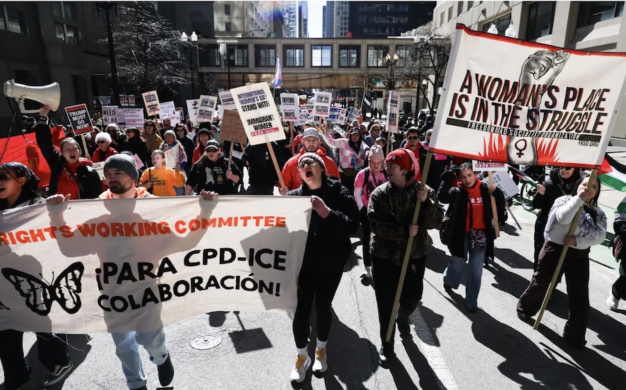 Protesters march north on Dearborn Street during the International Women’s Day March in Chicago on Sunday, March 8, 2026. Protesters denounced President Trump for his party’s limits on abortion access, sweeping immigration raids that have separated families and his inclusion in the Epstein files. Credit: Talia Sprague for Block Club Chicago